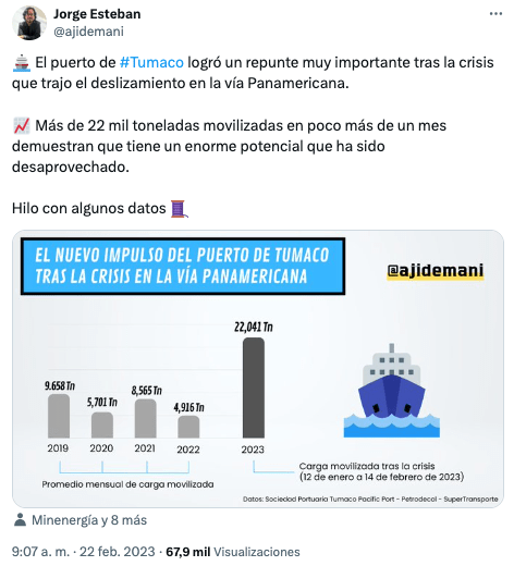 En este hilo de X se pueden leer otros datos que muestran un repunte en la actividad del puerto de Tumaco tras las crisis que se desató en Nariño por el deslizamiento en la vía Panamericana en inmediaciones de Rosas (Cauca).